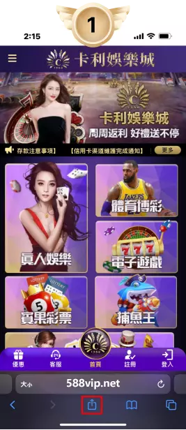 使用Safari瀏覽器,開啟卡利網頁,點擊畫面下方中間的分享按鈕